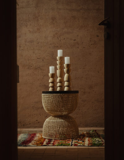 Pour un effet encore plus premium, utilise des bougies fines couleur lin, miel, terracotta ou noir mat : elles se marient parfaitement avec la profondeur et la texture du bois sculpté.
