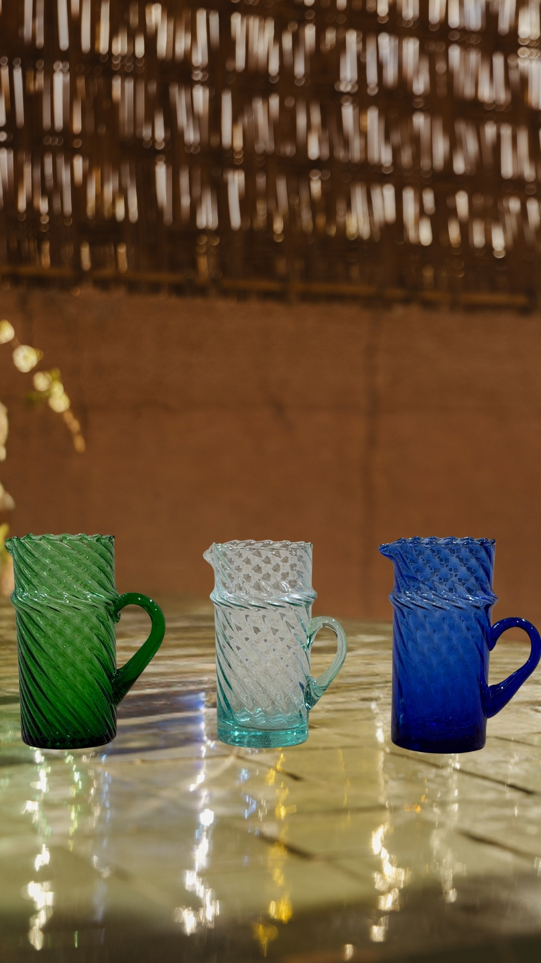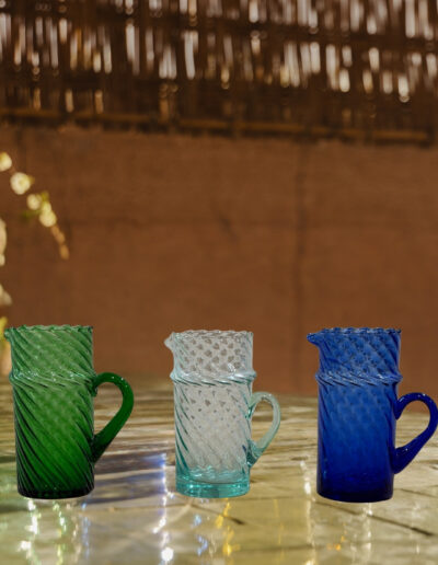 Disponible en trois teintes naturelles — transparent, vert et bleu — elle s’accorde à merveille avec les verres beldi assortis pour une table à la fois harmonieuse et vivante.