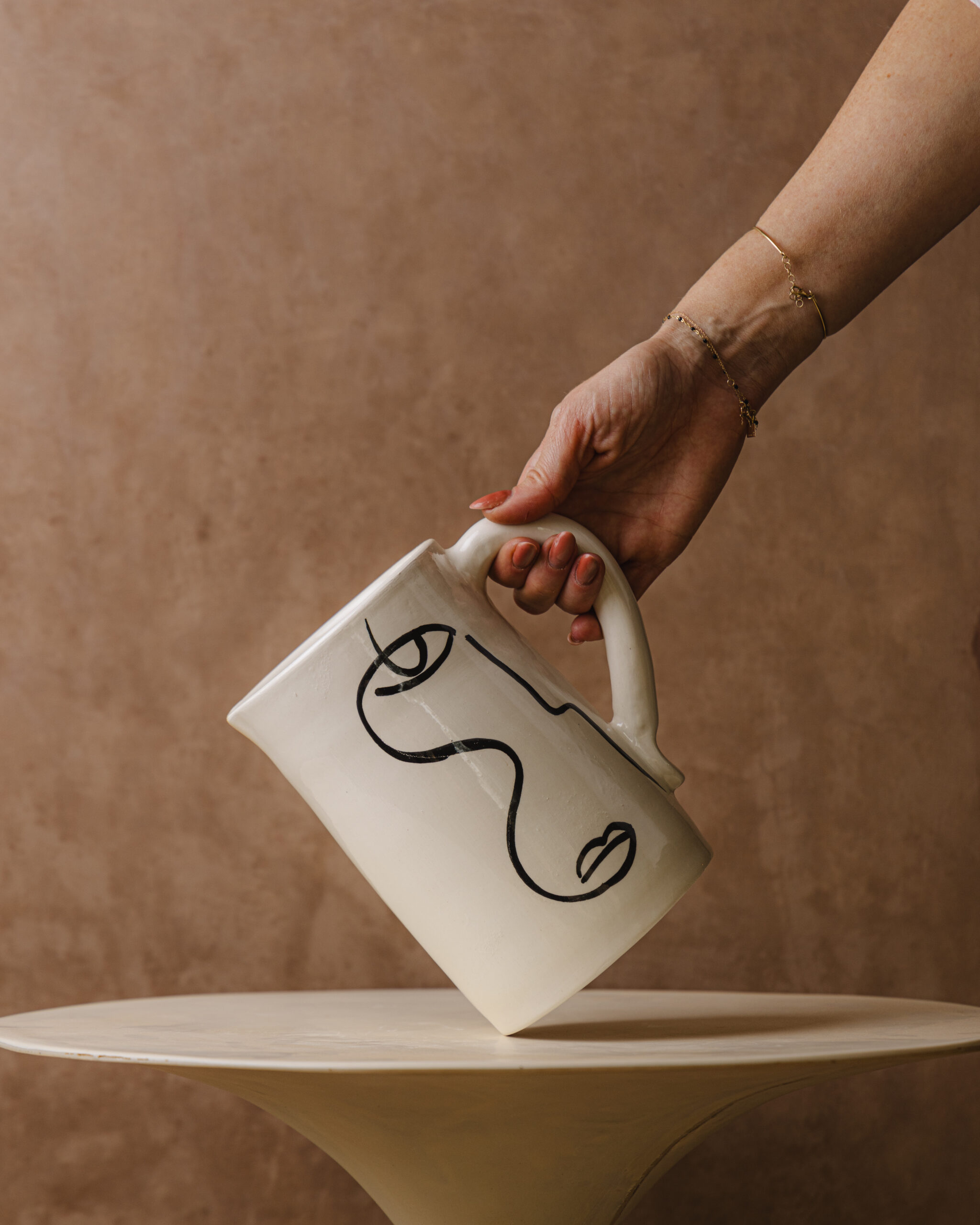 Son design épuré est sublimé par un motif artistique noir, tracé à la main, qui évoque une silhouette abstraite, hommage à la douceur des formes humaines et aux inspirations minimalistes contemporaines.