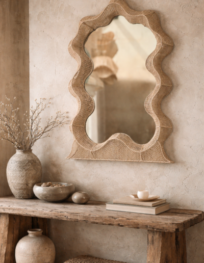 Le miroir Almée trouve naturellement sa place dans une entrée lumineuse, un salon épuré, ou une chambre bohème chic.