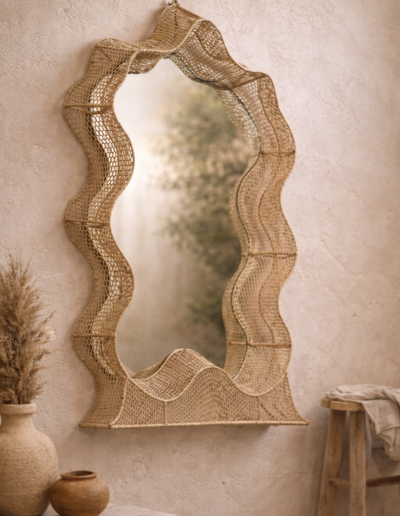 En grand format, Almée devient une pièce maîtresse – une invitation à célébrer la beauté du naturel et la poésie du geste artisanal. Pensé pour les amoureux du design bohème et artisanal, ce miroir allie légèreté, élégance et savoir-faire ancestral.