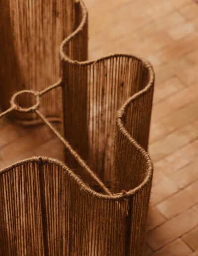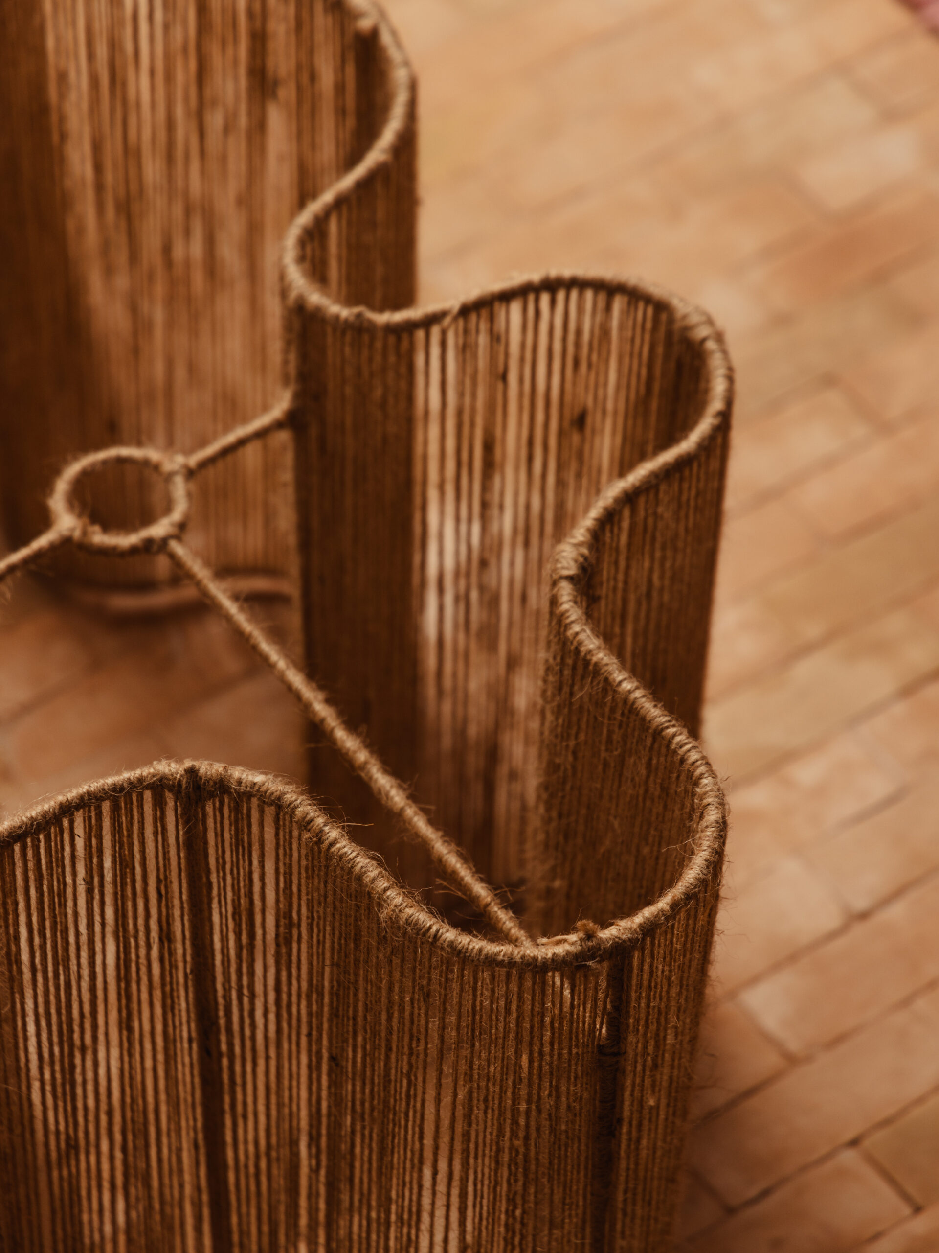 Son tissage artisanal en jute naturel révèle un subtil équilibre entre ombre et lumière, tandis que ses courbes ondulées rappellent les mouvements du vent ou le flux de la mer.