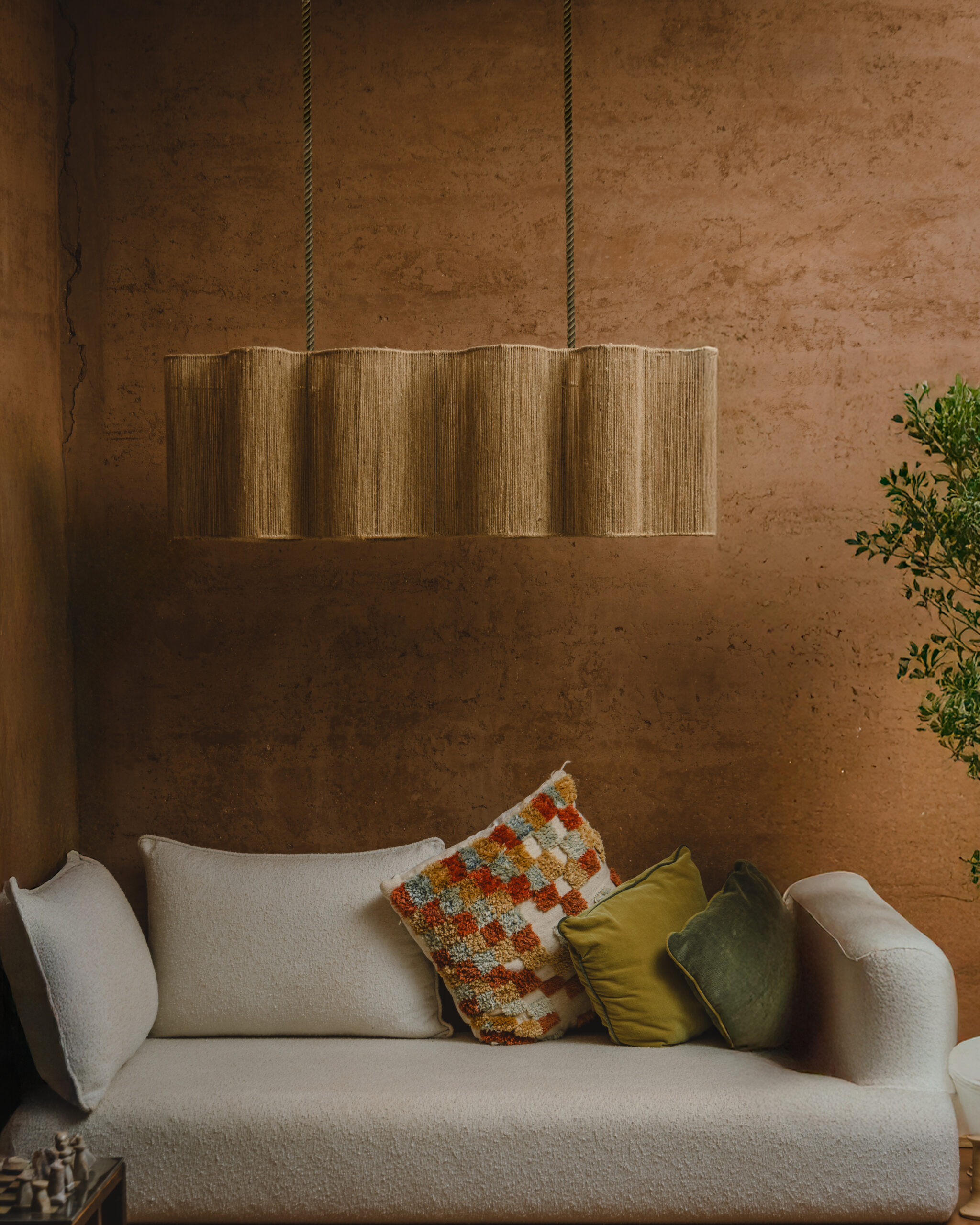 Astuce : sa forme ondulée se marie magnifiquement avec des murs clairs ou des plafonds hauts, où la lumière joue sur les reliefs du jute.