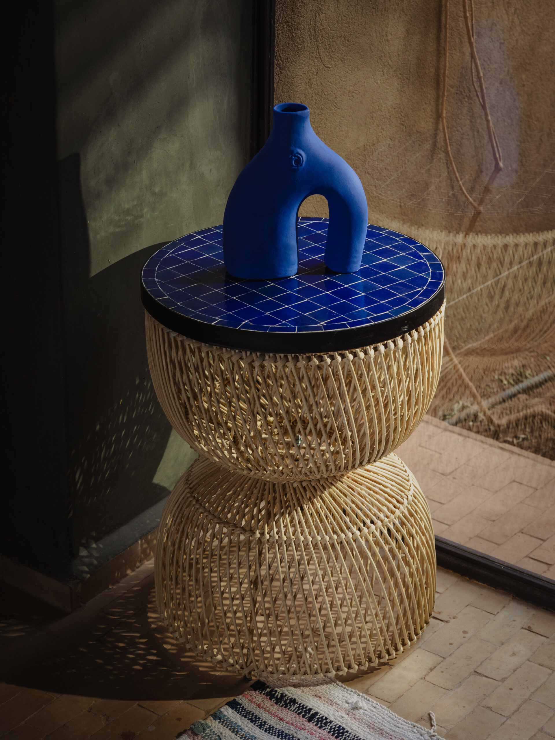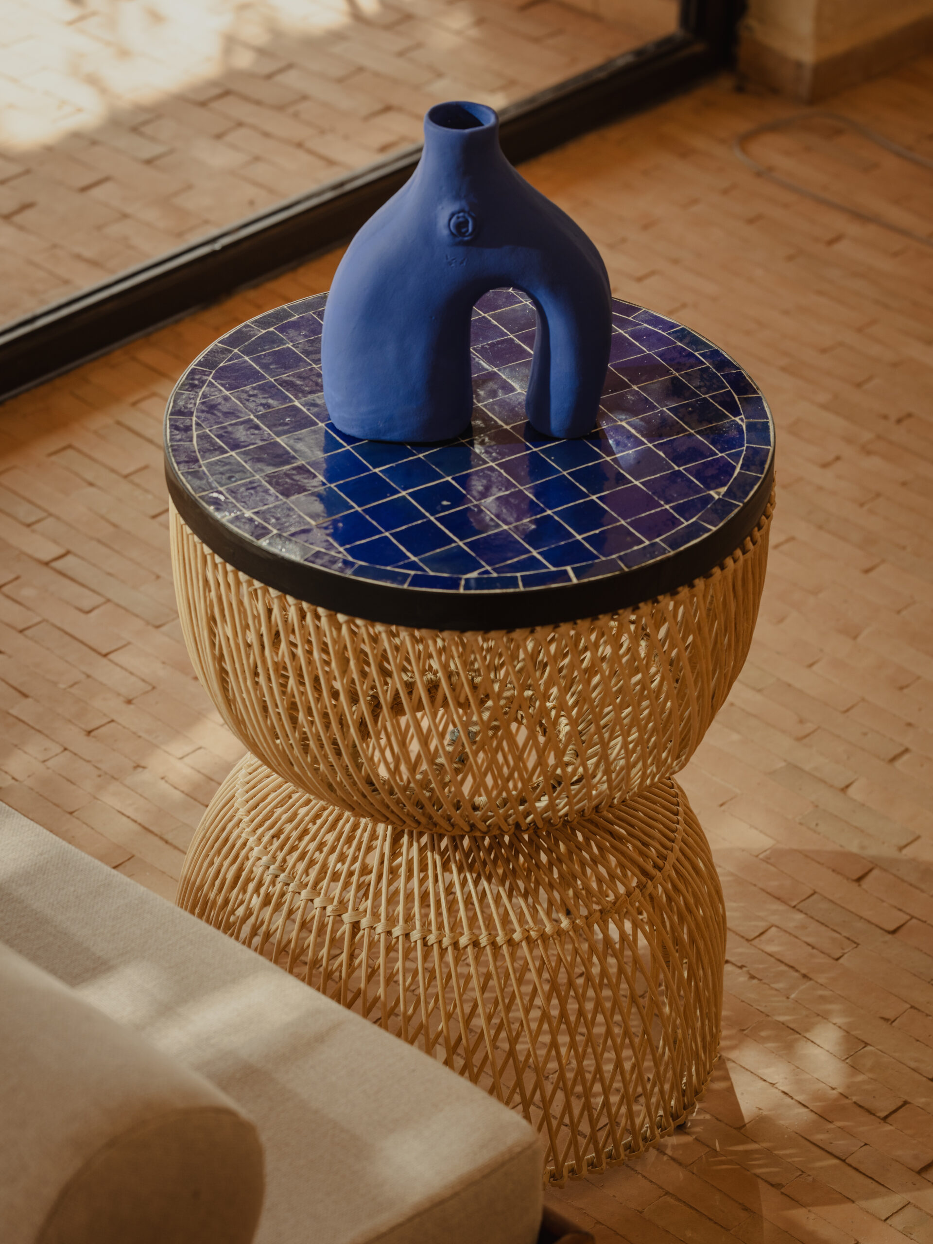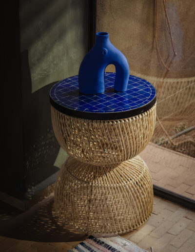 un piètement en rotin tressé à la main, aéré, sculptural et organique, associé à un plateau en zellige traditionnel, façonné et posé pièce par pièce par des maîtres artisans.