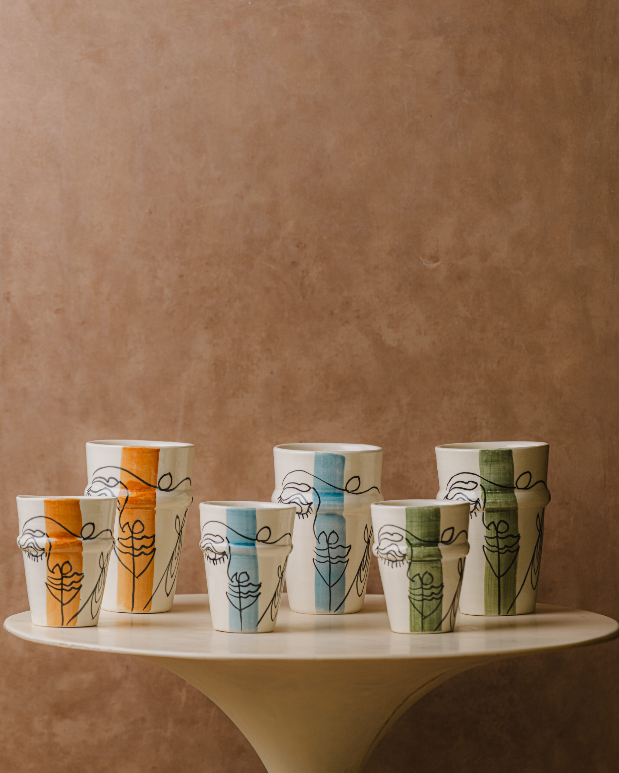 Tasses/ Verre Muse – en céramique artisanale peinte à la main, désign visage artistique – 2 tailles disponibles – 3 couleurs : miel, bleu azur, vert olive